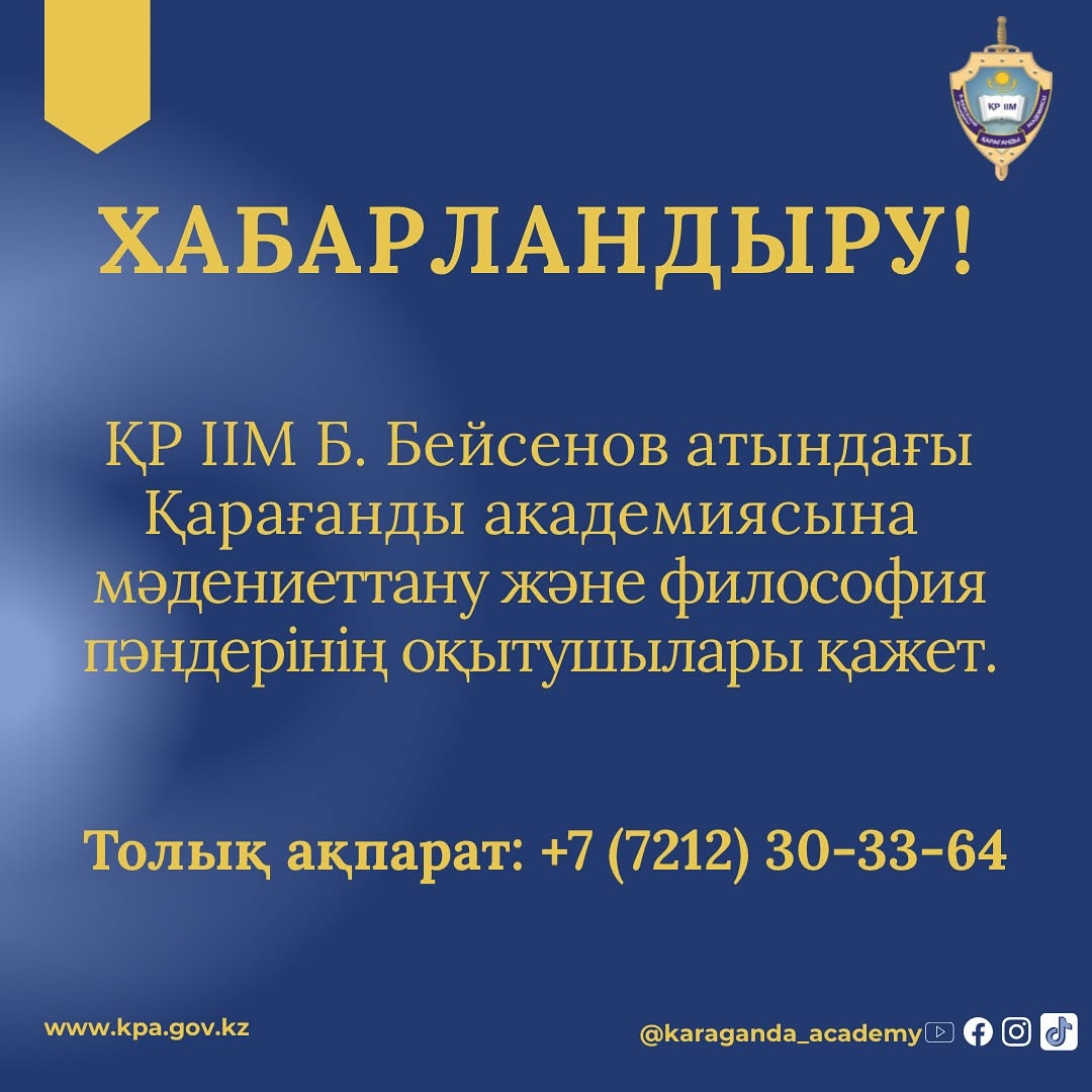 Хабарландыру! Қазақстан Республикасы ІІМ Бәрімбек Бейсенов атындағы Қарағанды академиясы сіздерді маңызды іс-шараға шақырады. Бұл іс-шара біздің академиямыздың қызметі мен жетістіктерін...