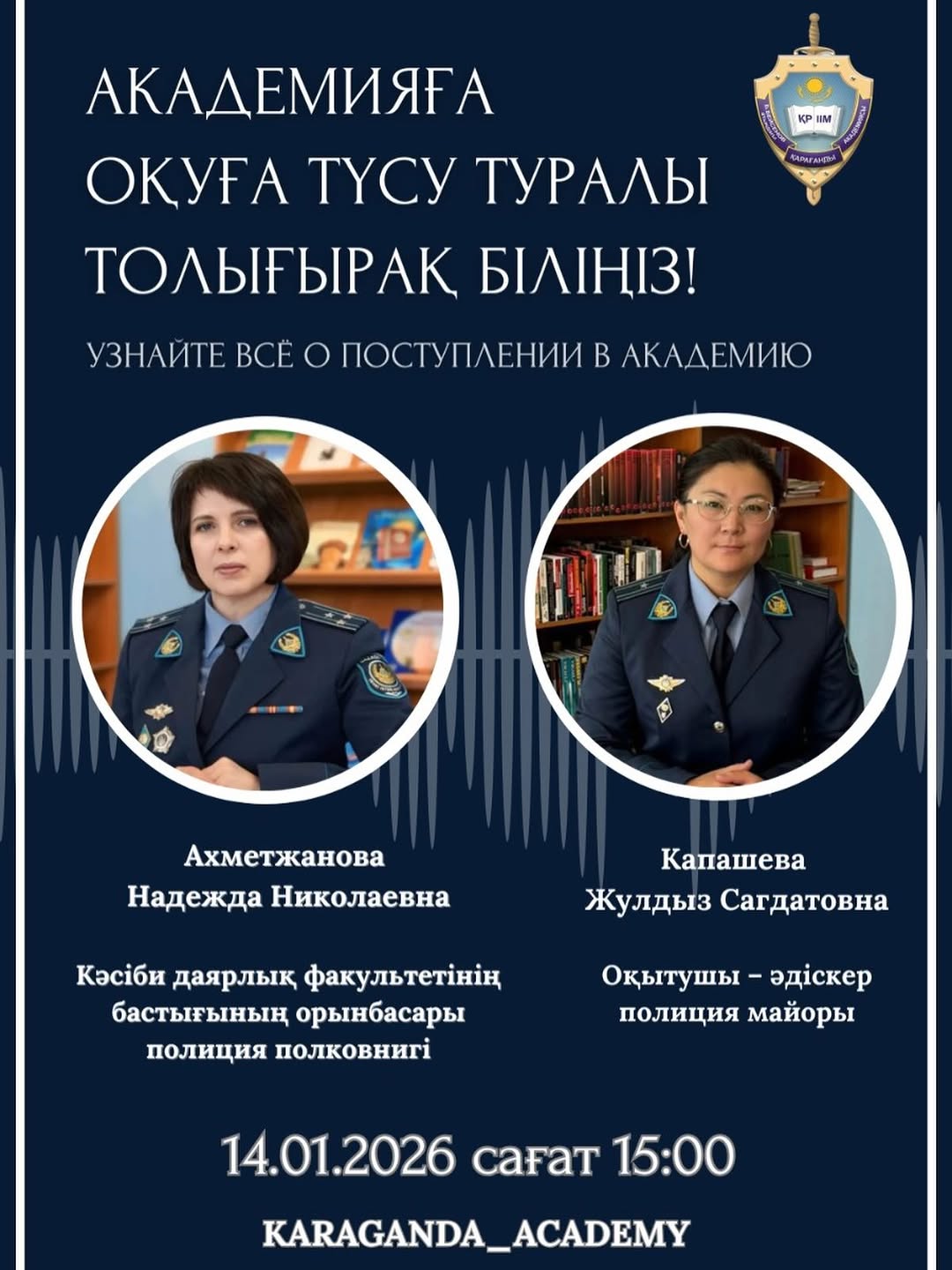 Уважаемые абитуриенты и родители! 14 января в 15:00 на официальной странице Карагандинской академии МВД РК имени Б. Бейсенова в Instagram...